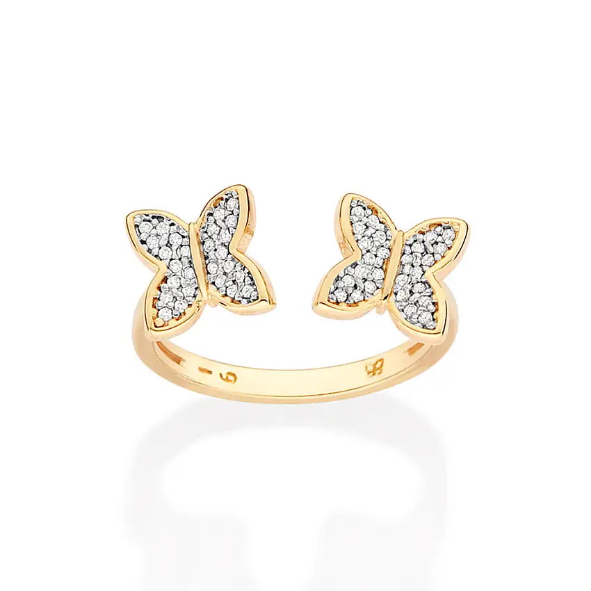 Promoção!Anéis | JOIA BANHADA OURO 18K | ANEL AJUSTÁVEL BORBOLETAS BANHADO A OURO 18K COM ZIRCÔNIAS E APLICAÇÃO DE RHODIUM – Rommanel