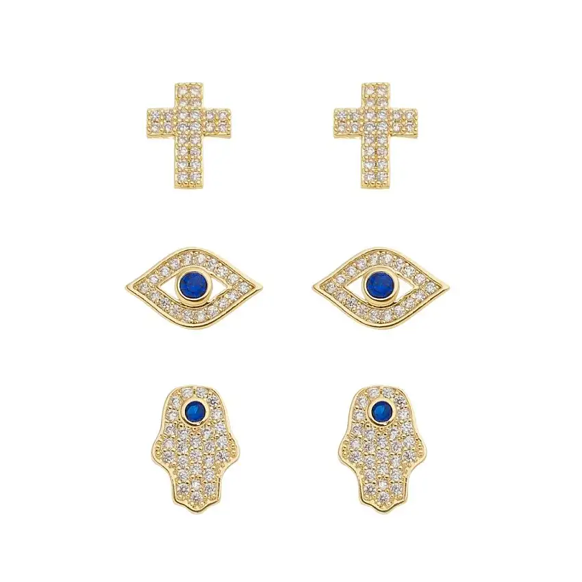 Promoção!Trio de Brincos Mia Olho Grego Mão Hamsa e Cruz Folheado a Ouro 18k