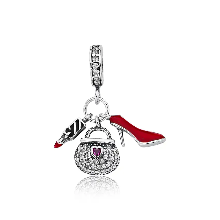 Berloque Prata c/ Ródio You Argola Cravejada Bolsa / Batom e Sapato Resina Vermelha