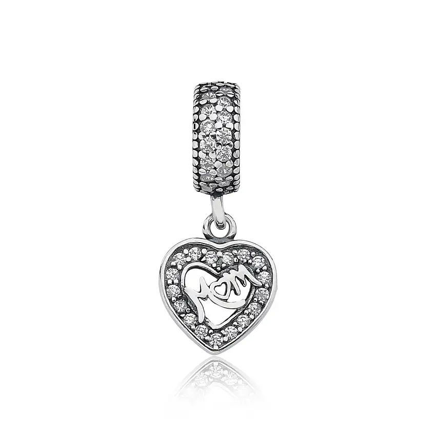 Promoção!Berloque Prata c/ Ródio You Argola e Coração Cravejado “Mom” Envelhecido