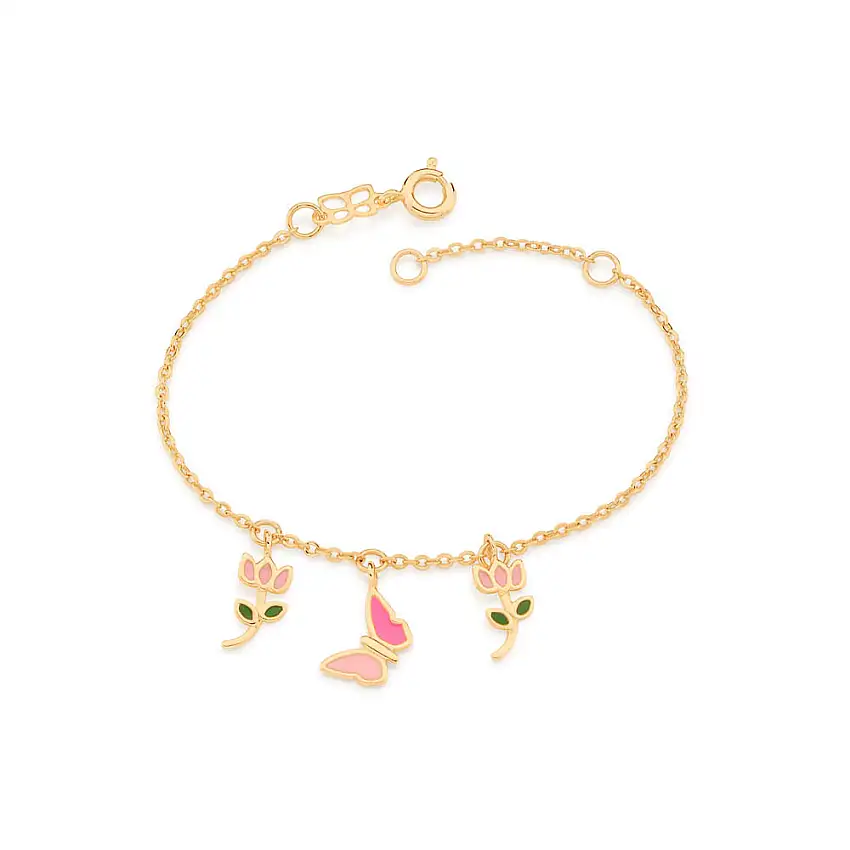 Promoção!Pulseiras | JOIA BANHADA OURO 18K | PULSEIRA INFANTIL BANHADA A OURO 18K COM BORBOLETAS COLORIDAS – Rommanel
