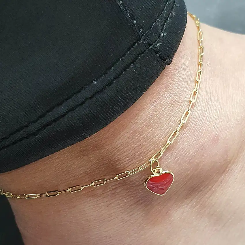 Promoção!Tornozeleira Folheada Dourada Coração Vermelho
