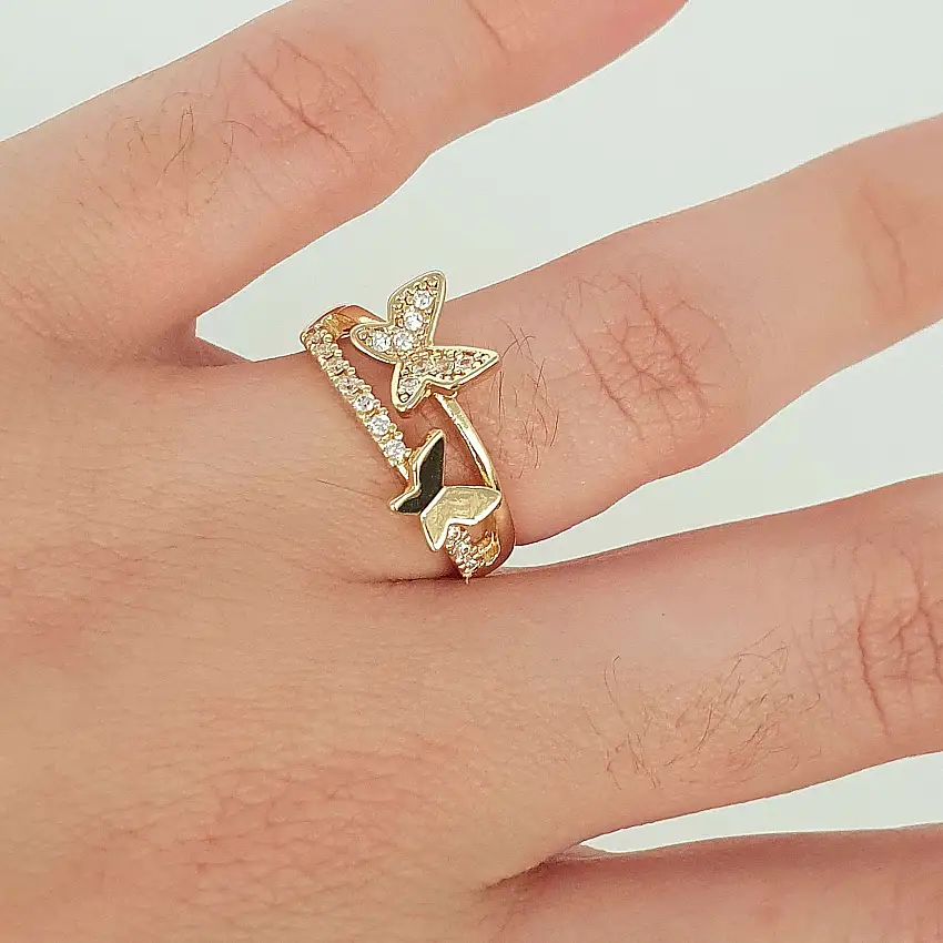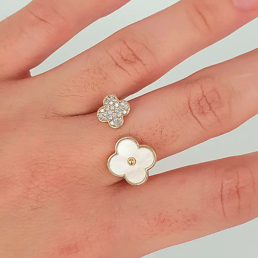 Anel Com Zircônia Cravejada Trevo Dourado Branco