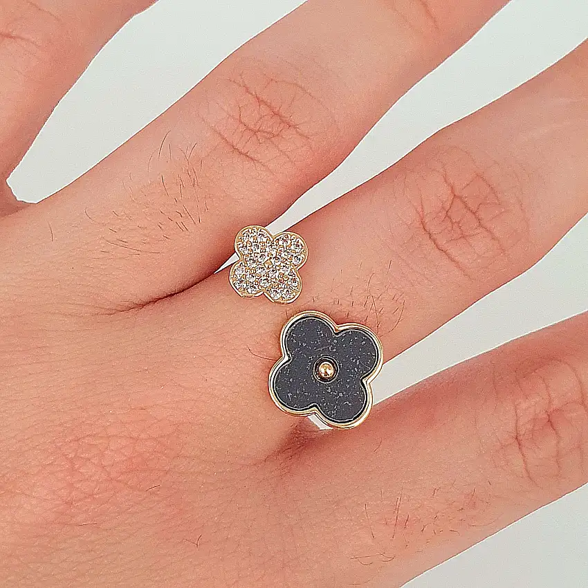 Anel Com Zircônia Cravejada Trevo Dourado Preto