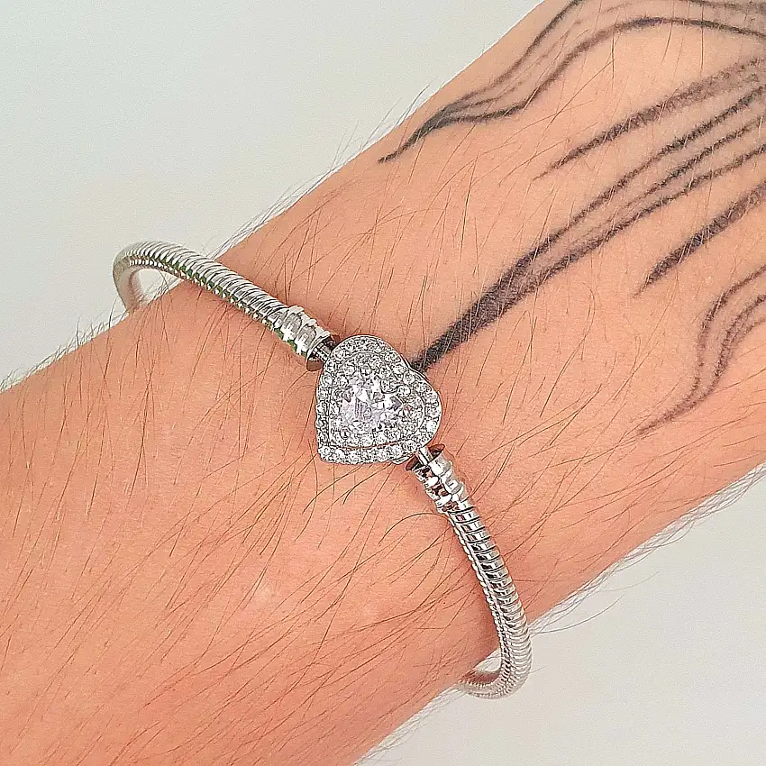Promoção!Pulseira Pandora Com Berloque Cravejada Em Zircônia Prata Coração
