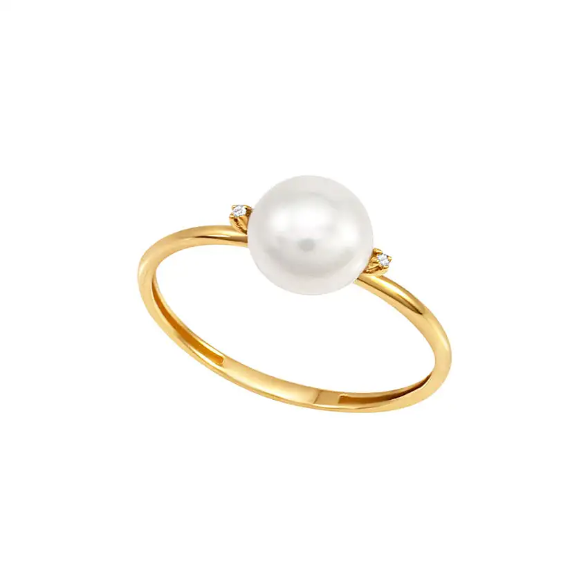 Anel de ouro amarelo 18K 750 com 1 pérola e 2 diamantes de 0.01 quilate. A coleção Memórias é uma releitura das pérolas, atribuindo um ar contemporâneo ao clássico dessa gema especial. É a história sendo contada de um outro ponto de vista, sem renegar suas