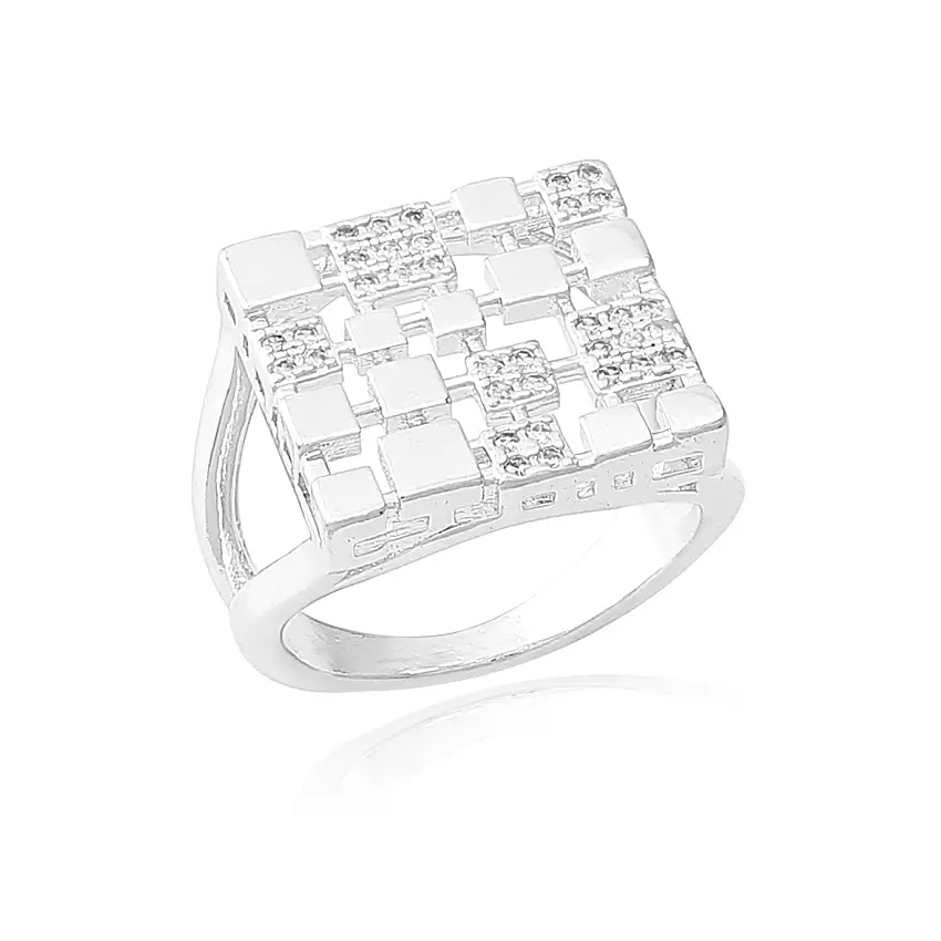 Anel Largo Detalhe Quadrado com Zircônias Folheado Prata 1000